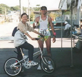 同じエイドで家内と,家内は75kmから自転車で応援→