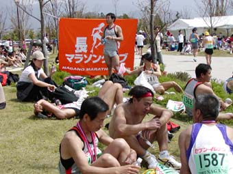 実はメダルは初完走の時などはいいのだが、大会に数多く出るようになると、あまりありがたくない。長野も確か第1回はバスタオル、毎年バスタオルでも困るが、フィニッシャーのタオルをかけてもらう感じはいい。泳ぎに行ったときでも完走者であることを誇示できるしね。八ヶ岳野辺山の木の完走メダル、NAHAマラソンの沖縄ガラスのメダルなど部屋にぶら下げてあるメダルもある。長野の第5回はバスタオルの復活か、これぞと思えるものにして欲しい。右の写真は上水内陸協の駅伝メンバーで、チームイージー長野の清水さんが送ってくれたもの。完走後のリラックスした様子がうかがえる。完走者がスタジアムを出てすぐの芝生に毎回NMCメンバーやそのお友達が集まる。今年は昨年作成のクラブ旗がいい目印で、県内外のお友達がすぐよってきてくれた。ここで、ビールが飲めると最高なのに、なぜか、長野マラソンではゴール会場で飲んでない。しいてあげれば、第1回の時キリンのサンプルを飲んだだけだ。わがクラブでは、当日4時半からのフェアゥエルパーティに大集合をかけていたので、それまでのお預け。明日又はあさってに続けて別の写真をアップ予定。