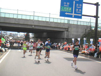 沿道の声援も凄い数で、写真左はそのひとつ小布施橋入りのカーブの大声援を抜け出てた所。ランナーを勇気づける沿道からのたくさんの声援には感謝します。長野マラソンの人気の一つは実はこの大声援なんです。市民マラソンでは交通規制などからの大会コースどり事情で沿道の声援がないとは言わないが少ないとろが多く、長野の声援はNAHAマラソンに次ぐ日本第2位の北海道マラソンとほぼ肩を並べます。県外からは前泊しないと参加できないことでも共通のこの3大会、全国から来られるランナーがまた来たくなるような雰囲気があるとすれば、その共通項は大声援なんです。地元ランナーにしても全国からたくさんのランナーが来られることは喜びで、ひとえに沿道の声援によるものと思っています。ほんとうにありがとうございました。