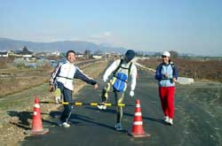 あとはオラホ地ビールマラニックのコース通り、戸倉のセブンイレブン(この日の30km地点)で昼食休憩。コンビに脇の陽だまりで軽食後、再び堤防道路にあがり、サイクリング道路に入り、、坂城大橋へ向かう順路だ。坂城大橋手前では携帯で連絡が取れていた木下さんの奥さんが走者要望の熱いお茶を用意して待っていてくれた。当初、寒さ予測で熱燗が用意される予定だったが、アルコールの度数が高いと走れなくなるとの声により、それではビールというところにいきそうだっが、熱いお茶でまとまったもの。