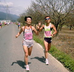 この大会では、過去に、折り返しを過ぎてからしばらくして、招待選手の君原さんに追いついたことがある。その後、ずっと後ろを走らせていただき、その無理のないフォームを体験させていただいた。最近は左膝かばいの走りが身についてだめだが、記録を更新していたころは、イメージとして、その走りが頭にあった。時々、かなり長く映っていたTV番組のビデオを繰り返し見たものだ。そんな思い出のある大会で、自己ベストは95年の1時間28分03秒だ。93、96、98年も各30分を切っているが、アップダウンコースで、同じハーフながら平坦な「あずみの池田」よりはタイムが2〜3分遅くなる感じだ。