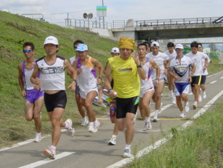 長野マラソンクラブ(NMC)では9月15日に昨年同様、更埴市の「千曲橋」下集合で、千曲川サイクリングロードを使った練習会を実施しました。本HPと相互リンクで4名のメンバーが重複のトライアスロン・クラブの「チームイージー長野」(TEN)のデュアスロンと同時開催で、総勢22名(NMC15名、内4名重複)が参加、NMCからデュアスロンに重複メンバー以外で4名が参加するなど、炎天下の自転車約30キロを含めたトレーニングは、結構激しいものがありました。