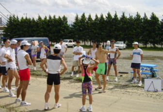 左は、ウォーミングウップ後、ランの折り返し点の説明、そしてデュアスロンのコース上の注意点説明は、アップ終了で汗をぬぐい、上半身裸の梨本さんから。