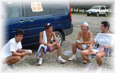 ラン組は自転車トップが戻るまでの約45〜50分ジョグということになっていましたが、宮本吉さんが跳躍系のトレーニングに空いていたグランドにおもむいた以外、座り込んでのおしゃべりタイム。