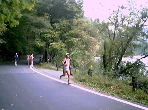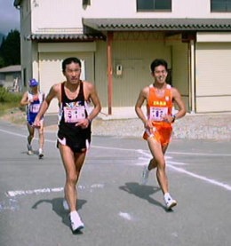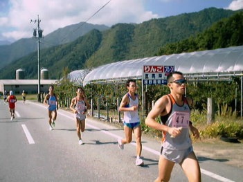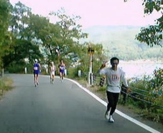 コース上の写真は三田がウエストポーチに入れたカシオLV10で、収めてあり、本トップページと別稿のマイダイアリー「10月」をもとに作る「第18回大町アルプスマラソンページ」で公開する。その1枚を左に。手前のロングタイツ姿は木崎湖の折り返し点から来た山口さんだ。