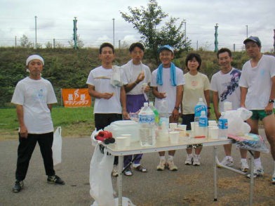 24時間練習会・チャリティ・リレーマラソンの終盤、サブトラック1周60秒内リレーが始まったのはこのあたりから。 千曲川ふれあい公園での9月15日の30q練習会の参加メンバー。この公園は堤防と河川敷でありながらトイレと水道完備でトレーニングにはもってこい。