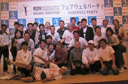 4月14日、第4回長野マラソンのフェアウエルパーティで。女子優勝のビクタギロワさんを中央にNMCメンバーとその家族・友人ら。
