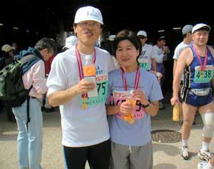 最初の写真は大会前のホームページで本人の了解なく勝手に5時間指標ランナーとさせていただいた丸山和男さん(4時間59分43秒)と初マラソンで最終関門を通過、しかもゴールは4分オーバーながらちゃんと記録の残る初ゴールを果した柳沢さんの二人。この時、競技場への入り口ゲートは硬く締められていた。出口ゲートは制限時間をいっぱいに使って走ったランナーの歓喜の顔や涙があった。
