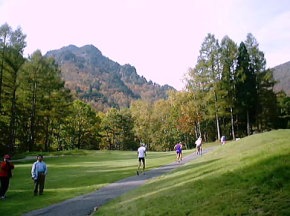 まず武捨さん「過酷なアップダウンにやっつけられてしまい、今だにふくらはぎと大腿四頭筋が筋肉痛です。三国スキー場からの下り以降、完璧にふくらはぎがやられ下りが思うように走れず、最後のゴルフ場インコースのアップダウンではかなりのペースダウン。けれど、目標設定の去年の大町(3時間54分)より5分ほどタイムが良かったし、紅葉もキレイだったし、周回コースのわりには変化のあるコースでちっとも飽きがこなくて気持ちよくトレーニングできたなという感じです。でも本当に手強いコースでした」(15日のメール)。左の三国スキー場への登りを頑張るのはその武捨さんだ。