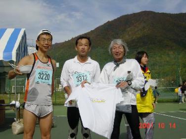 同大会の女子35歳以上は長野県の竹内淳子さんが3時間24分で優勝、彼女のこのタイムで長野県のランナーならこのコースがいかに厳しいものであったかお分かりになるだろう。その女子の2位にはウルトラ・ランナー藤原定子さんが44分で入った。この方、第1回四万十川ウルトラマラソンで腕に「素敵に快走」とマジック書きして本当にそう走って前半私を引っ張ってくれた方(もちろん藤原さんが先にゴール)だ。今回、2周目のゴルフ場内ののぼりでお話が出来た。現在ウルトラとフルと半々だそうで、フルも14分まできているという。フルでは勝てるがウルトラではとても藤原さんにかなわない。(右女子35歳以上の入賞者の表彰式)