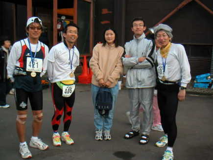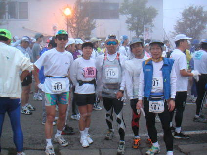 あわびの渡辺さんを含め,スタート前の記念撮影で気合十分.飯泉・武捨両氏が見つからなかったのが残念だが,朝もやの中を5:00にスタート。