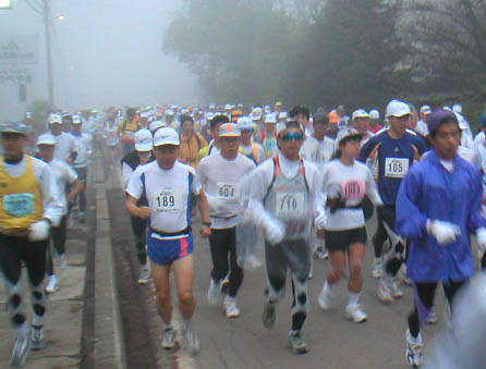 5:02撮影。朝もやの中、スタート地点から出て、右折、そしてしばらくのところ、CWXの木下さんとその横の渡辺さんをとらえたもので、少しブレているのでこれ以上大きくできない。渡辺さんの膝はキネジオテープでガードされている。前週エアロビックス・マラソンで膝に負担がかかっており、スタートから心配だった。