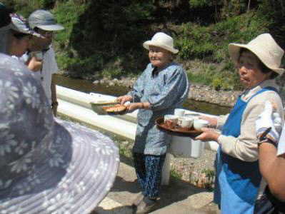 左は高木、右は飯泉。秋の大会時代、大会のためにスイカとっておいて下さり、たっぷり出してくれた私設エイド。春に移り、プチトマトなど。この日は漬物、お茶。12:50 13:16と時がたち、65kmの前後あたりか。菜の花が綺麗だった。依然渡辺さんが引っ張る。 13;17とさらに時が進む。暑い中、沿道に出ていて、あめや飲み物を用意していてくださったご婦人連グループ。おばあちゃん差し出す中身、なんだっか忘れてしまった。覚えている方、教えて?