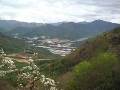 馬越峠への入口ではご近所の方々が出て応援してくださった。ここを走り切る人は人はごく稀。おおかたは歩きのところ。 馬越峠からは下を見る。中央に点在するのはビニールハウス。そこよりまだ下に下ることになるが、峠からはそこは見えない。