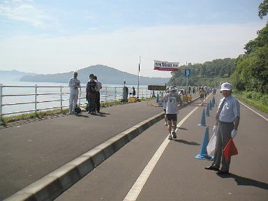 右の写真は、54.5kmあたりの「サロマ湖温泉・緑館」のレストステーションで。ここに着替え用に一応は半袖UVカット素材Tシャツ、ハーフタイツを置いていたが、サロマ100シューズのクッションをブルーからオレンジ(やわらかい方)に替えたのと、ソックスをランバードの5本指滑り止め付の薄物と替えた以外は、暑い盛りだったのでそのままの姿で出発した。(三田茂延のマイダイアリー7月4日より)
