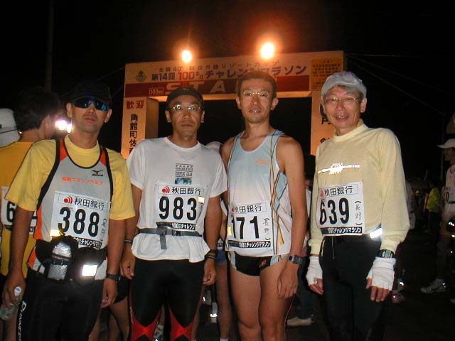 100kmの部エントリーは1202名。長野マラソンクラブからは4名がこの大会に臨み、うち二人(石川・木下)が車の各自走で、そしてJR三連休パス使用が二人(田村・三田)、日程が合わず、それぞれバラバラに現地につき、一緒にスタートラインに立った。その7分前の写真が上だ。