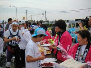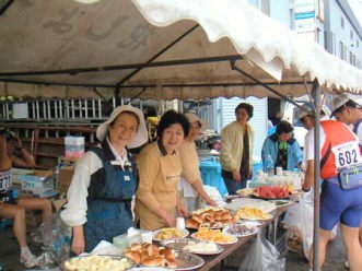 ずばり、秋田はおよそ10キロ地点から出てくるエイド、これが素晴らしい。そのエイドでの土地の方との語らいもいい。その最初のエイド「堂村三叉路」(10.26km)左の写真でお分かりのように、もうおにぎり(すし状のもの)が出ている。おにぎり、バナナ、レモン、オレンジ、梅干、氷砂糖、塩、ドリン