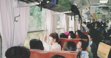 秋田内陸鉄道とコースはほぼ平行して走る。その鉄橋が後ろに見える。同鉄道は同日選手、応援家族は無料で、石川理香さんはこの電車で応援移動。その時の車中の写真を提供してくれた。選手が見えて手を振っている。ご主人の走り方は皆それぞれわかるらしい。列車の本数が少なく、24.23km「布谷商店前」エイドと49.67kmの50キロの部スタート手前エイドの二ヵ所での応援。、おそらく10時間台でないと最初のところでしか会えない。、