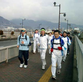 バスターミナルの交差点から再び長野マラソン新コースに戻ったが、ここで元旦マラソンに出ていた川中島走ろう会の人々と一緒になり、賑やかになった。なんでもこれから新年会だということだった。