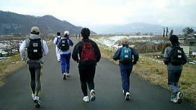 長野駅8:45出発時の長野の街は曇りだったが長野マラソン新コース本番35kmの手前地点岩野橋に向かう途中で青空が広がりだした。ウルトラ班自主企画だった昨年と同様、初詣マラニックは好天にめぐまれた。このマラニック実は元旦から3日までの好天気の日に実施と幅を持たせていたのだが、参加した9名のうちでは、元旦以外は都合がつかないという人が多く、その「元旦開催」の願いが通じた形だった。
