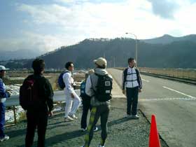 岩野橋では小休憩し、長野マラソン本番で渡る橋、対岸の堤防道路を望んだ。皆で3月までに繰り返し走る試走会コースを確認して次へ進んだ。