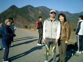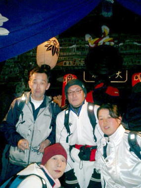 雨上がりの暖かい元旦の朝となった。隣県新潟・中郷村からの八木さんの車で長野駅に向かった。路面は降った雨でまだ濡れている。8時30分、改札口オリンピック看板前に集合したのは高橋百合子副会長はじめ、石川、飯泉、木下、八木、徳武(さ)、小宮山、三田の8名、43分の新幹線で佐久から三石さんが着き9名、長野マラソンクラブ(NMC)主催の2004善光寺〜北向観音50km初詣マラニック(実走距離48km)にエントリーしていたクラブメンバー全員が集合した。