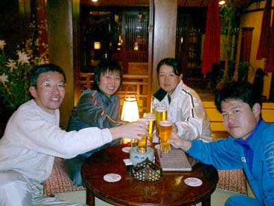 この後は、新潟の中郷村からきていた八木さんが家族との合流時間の関係で先に帰り、残り8名は17時45分頃より隣の老舗旅館「臨泉楼・柏屋別荘」の一服茶席「やまつつじ」で、生ビールをいただく。みんないい顔だ。昨年の倍の人数となり、ランナーならではの長距離マラニックで始まったの年の初めを改めて乾杯した。暖かい茶席で冷えた「生」がとても効いた。サービスで漬け物を添えてくださり、これがまたおいしかった。