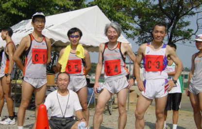 右は98年4月の信越駅伝以来の3年3ヵ月ぶりのランパン・ランシャツ姿の私。チームウエアは昨年10月の大町アルプスフルに間に合わせて14名つくり、なかなか着用機会のない私も作ったが、ついに着ることが出来た。山ちゃんに私のランパンランシャツ姿は珍しいと別に1枚とってもらってある。