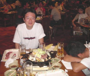 工場直のビールはうまく、生ラムジンギスカン食べ飲み放題一人3,400円コース。いくつか建物があり、中の写真はポプラ館、もちろん全館ジンギスカンで、これは壮観だつた。