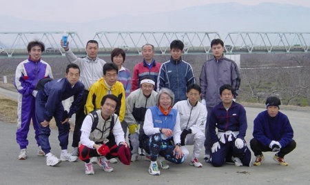 <試走後にビール500+篠ノ井駅のかけそば1杯飲食、後1時間>体脂肪率15.8 体脂肪量9.217 日 31 長野マラソンコースの小布施橋からの部分試走。(小布施橋は11:15のでスタート。南長野運動公園14:10着。) 58.0 曇り、NMC主催、事前把握人数11名、クラブメンバーは今回は連絡なしでもOKとしていたので、把握できなかった2名が当日参加、他に山崎さん関係で1名、計14名の参加となった。いつものように集合写真を撮ってもらい、スタート。初参加の柳沢さん(谷川真理ハーフ2時間10分)は6分15くらいで堤防道路を行く。20キロ近くから7分台に落ちたが、長野マラソン当日は重いトレーニングウエアでなくなるし、7分台に落ちるのが25〜30km間に来れば、ぎりぎりの完走が出来るのではないか。初めからキロ7分00秒押し通して4時間55分22秒。7分10秒では5時間2分24秒。7分の遅いペースでゆっくり走リ続けることはウルトラ経験者でないとかなりむずかしいので、今日のように6分15秒近辺のマイペースで、いける距離を伸ばすことかな。ゴール後、さっそくNMCに加入いただき、女性会員が5名(45名中)となった。まだ、長野マラソン本番まで8週ある。次回公式試走会3月10日にもう一度25kmを走って今回より楽になっていれば、いいのではないかな。