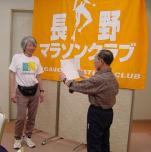 その相手は年間走行距離No.1の小島さん、「4,474km、とてつもないことをしてくれた。これは体に良くないのではないか?今後も休むことなく自分の記録に挑戦してください。大きな希望と勇気を与えてくれた。」とユーモア交じりの感謝状だ。そして思いがけずに私・事務局にも、「会のために自分の走る時間を事務局にかけてくれた」と。感謝状は朗読で、ランナーにふさわしいビール券一封をいただいた。小島さんのは改めてトップページで紹介するとして、私のをここに。走り込み大会の宣伝のためそのTシャツを着ている。