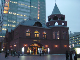 前日の水分補給はビールだと、恵比寿のビアステーションへ行く。これより前、あわびの渡辺さんにアートスポーツ近辺のスポーツショップを案内してもらい買い物。普段なら午後2時台の時間帯では、かなりビールが入っているはずが、さすがに控え目にランチタイムでの中ビン1本のみだった。思えばそれもエビス。そして恵比寿でエビス。残念なのはレストランが禁煙でないことだ。一人で行ったので中央の丸いカウンタ一の席に案内されたが一つ空いた席の隣のご夫人が喫煙、周辺でもタバコを吸っている人たちがいて、煙が回ってくる。仕方なく、さっさとジャーマンポテトともう一つ暖かい煮込みものを食べ、大ジョッキ1杯とヘニンガー小瓶1本をあけて出た。写真はその出た時撮影のもの。何か夕暮れの札幌ビール園を思い出させる。