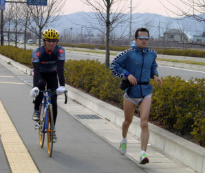 テレビではNHKが長野マラソンのスポットも入れるようになったし、いよいよ長野マラソンという感じになって来た。先にいただいていた轟さんの佐倉マラソンレポート、にある距離表示のあるトレーニングコース、これが欲しいね。東和田の運動公園自体、アクアウイング前道路の貫通で、外周をトレーニングしていた人は危険にさらされているし、市民ランナーにはお寒い現状だ。次回の市長選などのときは、候補者にアンケートでも出して、長野マラソンの長野市として、身近なトレーニングコースの整備や、運動公園外周ウッドチップスのランコースなどの案を突きつけてみようか。累計73km9 土 ‐ ‐ ‐ 走る時間はあったのに、休日ビールの極楽三昧でした。たまにはこういう日もないと私らしくなくなる。 10 日 31 長野マラソン第5回試走会、小布施橋13:07スタート→南長野運動公園15:40 ‐ 今日一番の写真はこれ。梨本さんの横のロードレーサ伴走は途中から。自転車乗りの方なら知っている方です。さて誰でしょう? 梨本さんは今日一番の距離を走りました。フルの距離を超えたのでは?