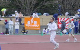 松代大橋へのカーブ過ぎで「はるな梅マラソン」から帰ってきた丸山一二三さんのクルマがクラクションを鳴らし横付け。飯泉さんのほかにもう一人NMCの男子がいたようだ。誰だろう? 柳沢さんはわからなかったと…。彼女のタイムが楽しみなんだけど。その松代大橋では、Mウェーブから先頭グループを見てそれより先にスタートを切っていた丸山和男さんが、聖火台から折り返し元気にやってきた。自宅までおおよそ30キロの行程を設定していて、調子はよさそうだ。昨年1年間赤ちゃんとともにがんばった分、トレーニング不足になっていて完走目標にしている。土日のいずれかで少し長い距離、また毎日昼に5キロは走り込んでいるといい、今日の状態次第では完走への手ごたえが出てくるのではないか。