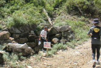 左の写真は28キロあたりの「天然エイド」のひとつ。看板も出ている。下から上がってくる人あり、右を行く林さんが、その方と交代で中におり、給水をした。