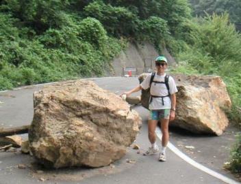 石川さんと戸隠奥社マラニックに出かけた。JA上松をJA浅川配送所と場所を間違えていて、携帯に電話をもらい、少し下の上松JAへ移動、7:05に合流。石川さんに岩の横に立ってもらった写真のように土砂崩れの落石で通行止めになっている旧道から飯綱へのぼった。そして旧の戸隠高原健康マラソンの折り返し点に出て、その懐かしいコースを走ることで距離を稼ぎ、宝光社、中社を経て奥社へ。石川さんは35km、私の方は、30kmくらいか。