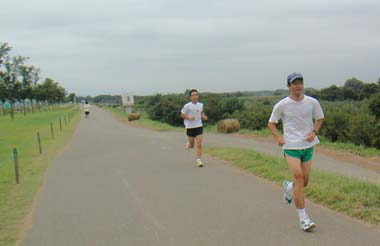 <jog後計測>体重左枠、体脂肪率15.0 体脂肪量8.7同15 日 14 10:15頃〜9:00集合の千曲川ふれあい公園コース練習会の中で、1周遅れで走る。HH使用。 57.4 千曲川ふれあい公園練習会は雨もあがり、曇っていて走るにはもってこいの気候となる。9時集合で、一番遅れたのは私だ。しかし、9時ジャストだったはず。小布施ハイウェイパークのデイキャンプ場部分にも入り、ほとんどクルマの心配のない片道5キロのコースを自転車で測定。そこを走ってもらった。写真は30キロを快調に走った三野さんと羽田さん、遠く反対方向に見えるのは柳沢さんだ。堤防道路は平らで走りやすいが、この日は風もなく特に走りやすかった。解散前、私がシャッターを押した集合写真はここ。20キロ走り、先に帰られた小林さんがそこでは抜けている。カシオの時計に歩幅102で往復ピタリ10kmが出た。2日続けてHH、少し筋肉に張りが出ている。水道とトイレがあり、コースの7割がクルマ進入禁止で安全が確保される堤防は北信濃エリアではここだけか?安全な片道5キロが取れるので、フル試走会などもここでできる。走り終えて給水と柳沢さんと杉山会長が持ってきたパンを食べながら、柳沢さんの携帯で高木さんによる丹後100キロの田村・武捨両氏の実況を読んで、興奮。帰ってパソコンにへばりついて、この続報をまっていたが、ラスト20キロの二人の素晴らしい走りが伝わり、思わずビールの栓があいた。累計140km