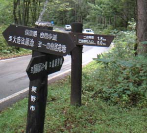 谷地湿原を半周周回して自然歩道に入る。途中道路を3ヵ所横断してこの歩道は森の中を進むが、一部バードラインの脇を通る部分があって残念なところがある。標識もきちんと立てられているから、迷うこともない。ただ、戸隠中社まで2.9km地点のそば畑のある戸隠展望苑前の看板に「熊出没注意」の赤字の警告がある。もちろん、飯綱への旧道部分から、熊避け鈴をディ・バッグに吊り下げ、鳴らしながら来ている。前回のように落とさないようにと、点検を入れて、さらに先に進む。森の道は足に優しく、また気持ちがよく、それほどの上りもないから熊さえ出なければずっと走っていたい。
