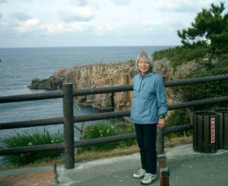 南紀白浜空港からホテルに着くまで、白浜の名所めぐりをしてくれた。ここは、50mの断崖・三段壁をバックに。