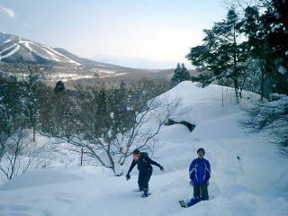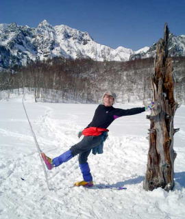アウトドアスポーツは本当に天気次第だ。絶好の日和で風もなく、ウインドブレーカー、ベストとも腹部に巻き付けている。かかとのあがるクロカンのスケーティングタイプのスキーを履いている。バックの山はもちろん戸隠連峰(西岳側)だ。
