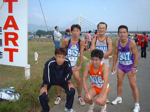 | 10月6日、大町アルプスマラソンのスタート10分前、昨年同様に陸上競技場のメインポール下に張ったクラブ旗前で撮影。この日に出走したNMCメンバーから2名がもれていますが、代わって入っているのは、信大工学部高木研の初マラソンの学生さん二人(完走しました)と肋骨骨折で応援にまわった西島さん。NMCチームウエアは轟、塩沢、山崎の3名、チーム・カラーのオレンジのラインが遠くからでも確認でき、二つの折り返しでの行き会いで、3名の走行写真は撮影は成功、内1枚を下で使用しています。また高木・三田はオクトーバーラン2002のクラブ名入りTシャツで走り、クラブをPR。 |