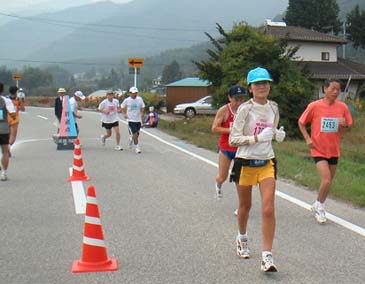 | 大町アルプスマラソン前半の下りの最も低い部分からの折り返し。迫田さん(福岡)をとらえる。このシーンの先頭です。迫田さんがゴールに入るといつも決まって表彰式が待っている。この日も壮年女子の部2位入賞。上の写真の千田さんとともに長野県は長野・セルフディスカバリー・大町と42k級は完全制覇。地元なのにNMCではこれは三田一人しかいない。 |