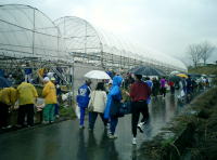 がない。そこに上がるわき道沿いの畑のビニールハウスが会場に着いた選手の避難場となっていた。
