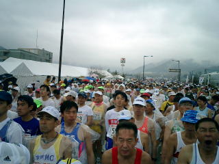 NHK教育テレビの生中継の関係でスタート時間は9:05. オリンピックのために作られた道は広く4714人のスタートライン切りまではおそらく4分かかるかどうかではなかったか。この大会は参加費が他のフルの大会より割高だが、その分ネットタイム(自分がスタートラインを切ってからゴールラインを切るまで)が出されるので、自分の正確な記録が得られるメリットもある。