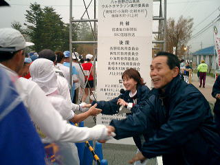 同大会会場は当日「風の陣」というお祭りイベントが催されて、家族連れで参加しても家族がフルマラソンの時間中も楽しめる。木下さんが珍しく家族連れで来ていたのはそのため。この点からもコースは厳しいがいい大会だ。そうそう、ハーフやウォーキングもあるから、それぞれに出るという楽しみ方もある。さらに驚くことが…、