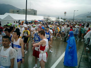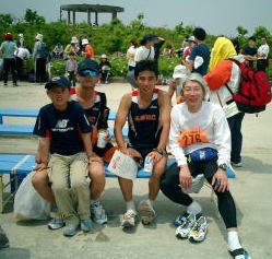 一方、参加人数が30名と制限されている「武蔵野の路東京1周ウルトラマラニック」、何でも東京の山、公園、川、海、街をめぐる260kmという、それに飯泉大輔さん(高山村)が初参加、3日朝5:00まもなく江戸川区の葛西健康センターゆの郷からスタートする。ゴールは5日の19:00〜21:00といい制限時間は64時間のようだ。飯泉さんはこれを完走すると距離では石川を抜きクラブトップとなる。ただ長野マラソン前より体調がすくれない面があったので、無理をしなしで欲しい。受付や説明会の行われた前夜、NMCの走友で2001年ランナーズ全日本走りこみ大会個人総合トップあわび走友会の渡辺さんが飯泉さんを激励にかけつけて下さった。