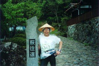 | 資料写真:1999年は雨だった。萩往還マラニック。この大会の一番おいしいコース70kmを走った時の三田だ。石川さんは5日午後2時頃までにはこの道を帰ってくるはずだ。笠は石川さんより伝授されたもので、石川さんは善光寺の文字の入った笠で走っているはず。これは日よけにも、雨にもいい。 |
