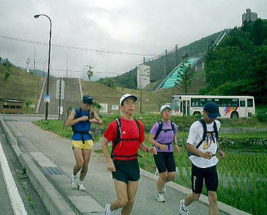 前回このページで長野マラソンの新コース案を紹介した際、「長野マラソンクラブでは新コースが長野市内の五輪施設だけをまわる平坦コースが予測されていたことから、コースから外れる山ノ内町などを含め長野市内の下界の施設だけでなくフリースタイルの飯綱高原もちろん、ジャンプやクロカンの白馬、カーリング軽井沢、バイアスロン野沢温泉、アルペンの山ノ内・志賀までを網羅する文字通り長野五輪記念マラニックを実施する計画で6月14日からそのコース選定の試走会に入っている」と書いた。そのいわば試走のマラニックを14・15両日実施しました。既にウルトラ班ホームページでその詳報が報告されているので、ここでは概要をお伝えします。