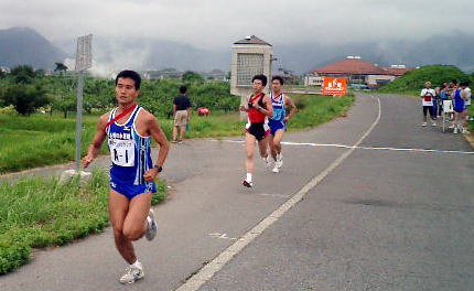 1区は長野日本無線陸上部を代表する市川さんNMCの和田、八木、両クラブ会員になっている山本が挑んだレースで、まさに激走区間だった。(写真左はその市川を追う和田、山本)